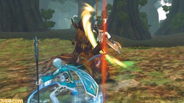 Passando alla sfera dei combattimenti, sappiamo che i membri della Heavenly Tribe combatteranno a fianco degli umani, pur mantenendo differenze culturali che portano ad avere stili di combattimento diversi: gli umani si specializzano nel combattimento ravvicinato, e la maggior parte delle abilità hanno a che fare con forza e movimento; essi avranno due comandi distinti, uno riguardante skill di rapidità, e l’altro adibito alle Artes, le quali spezzano la difesa nemica. Mentre gli umani attirano l’attenzione dei mostri, i membri della Heavenly Tribe sono liberi di lanciare incantesimi a lungo raggio, detti Heaven Echo Artes; l’altro comando consentirà loro di effettuare attacchi a medio raggio. Possiamo vedere le due razze in azione nelle seguenti immagini: