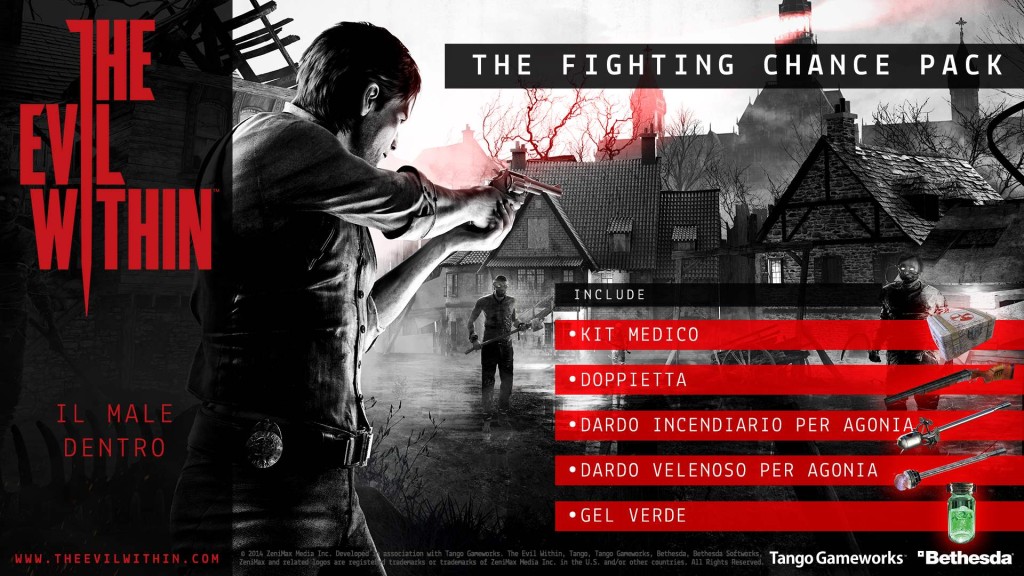 Oggi è stato anche presentato l’incentivo di prenotazione di The Evil Within, il Fighting Chance Pack, che fornirà ai giocatori alcuni utili oggetti aggiuntivi per ritardare un po’ di più la propria dipartita.