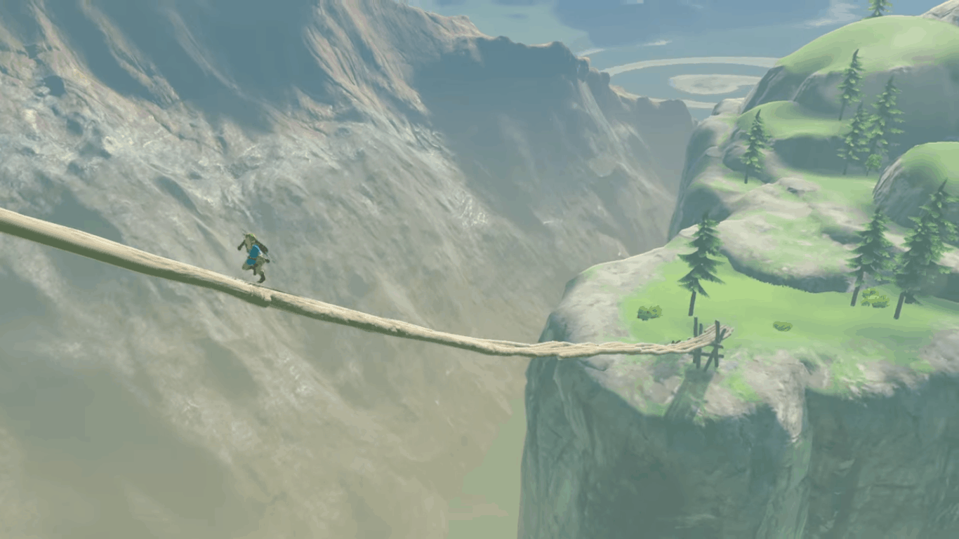 Si passa poi a un’inquadratura alle spalle di Link, che osserva una zona collinare dall’alto di una formazione rocciosa. Dopo poco viene mostrato il nostro protagonista su un ponte che sfida le leggi della fisica: dove condurrà? Che sia forse una passerella per la fortezza volante?