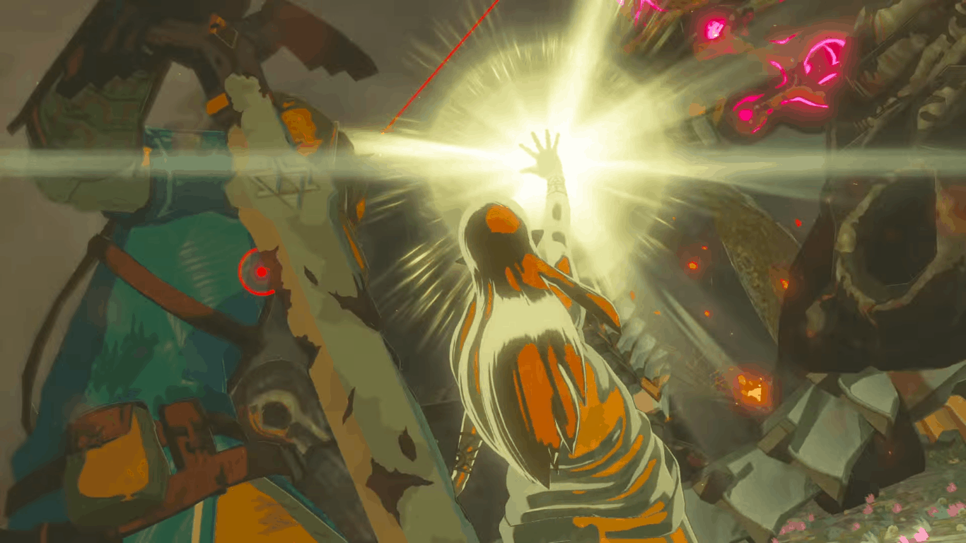 Zelda, in un campo di battaglia, fa uso di un incantesimo per fermare un Guardiano che sta per colpire Link. Interessante notare come la Master Sword sia già arrugginita.
