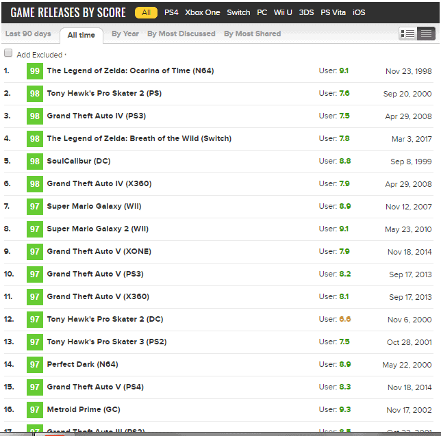 Al momento Breath of the Wild ha totalizzato un metascore di 98/100 con 63 recensioni della critica, ed è quarto nella classifica dei migliori videogiochi di tutti i tempi: