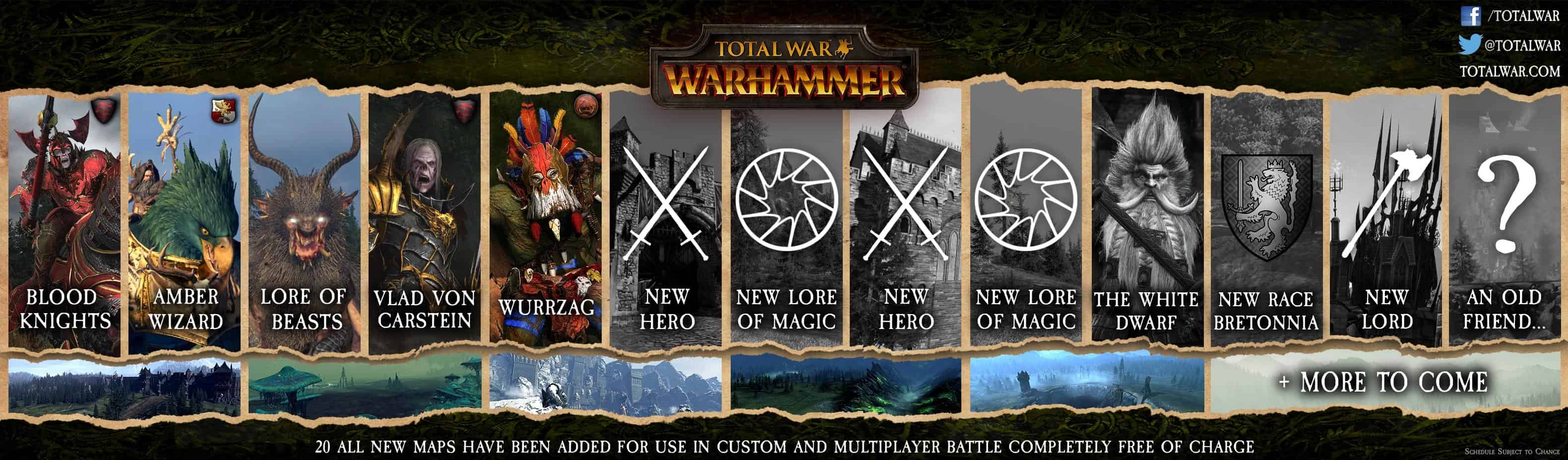 Nella giornata di oggi Creative Assembly ha pubblicato un post su Facebook illustrando i piani a breve termine per Total War: Warhammer, l’ultimo titolo dello studio. In generale, oggi sono arrivate parecchie informazioni sul gioco tutte in una volta, che cercherò di riassumere nel modo più chiaro e comprensibile possibile.