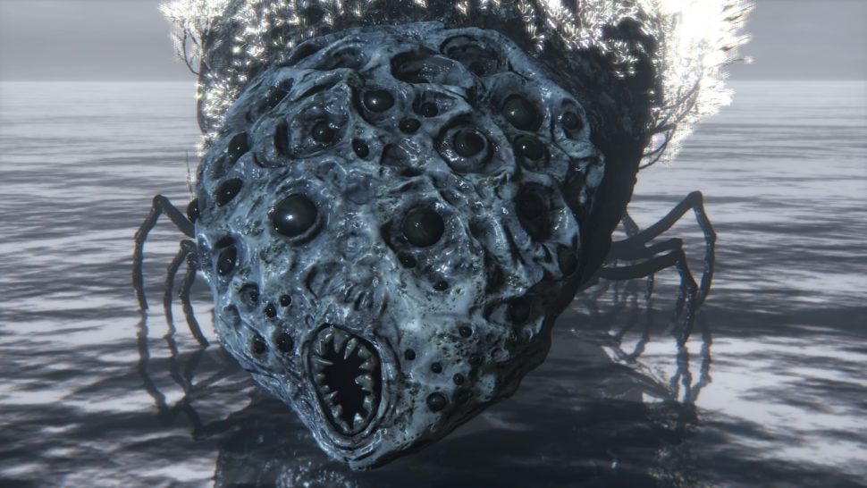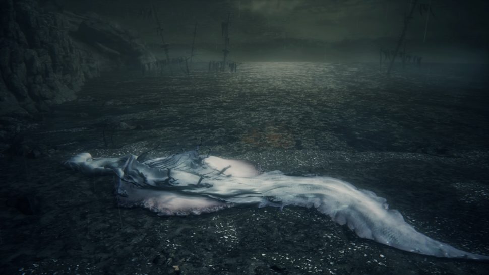 Poco tempo dopo quella di Pthumeru, Byrgenwerth effettua un’altra scoperta incredibile: in un villaggio di pescatori, presumibilmente da qualche parte nei dintorni di Yharnam, gli abitanti venerano una grande creatura marina comparsa sulle loro spiagge, e questo sta permettendo loro di tramutarsi in esseri a metà tra uomo e pesce. Willem ordina quindi, presumibilmente agli stessi guerrieri che già si erano fatti strada nelle pericolose rovine di Pthumeru, di recarsi al villaggio e recuperare quanti più materiali di studio possibile per la scuola. La spedizione, a cui prendono parte anche Gehrman e Maria, non si conclude in modo pacifico: la popolazione viene massacrata e i corpi vengono fatti a pezzi per essere studiati, e anche il figlio neonato o ancora non partorito della misteriosa creatura marina, il Grande Essere Kos, finisce ucciso. Non è per nulla chiaro se i soldati di Byrgenwerth incontrino fisicamente e uccidano anche Kos stessa; alcuni elementi (non ultimo il nome “Orfano di Kos”) suggeriscono che sia così, mentre altri aspetti della vicenda lo rendono più improbabile (come la stranezza, su cui tornerò meglio dopo, dell’idea che un Grande Essere produca personalmente un figlio), e che il cadavere di Kos che si vede nell’Incubo del Cacciatore sia frutto o vincolato all’Incubo stesso, e non sia mai stato nel vero villaggio visitato dai soldati.