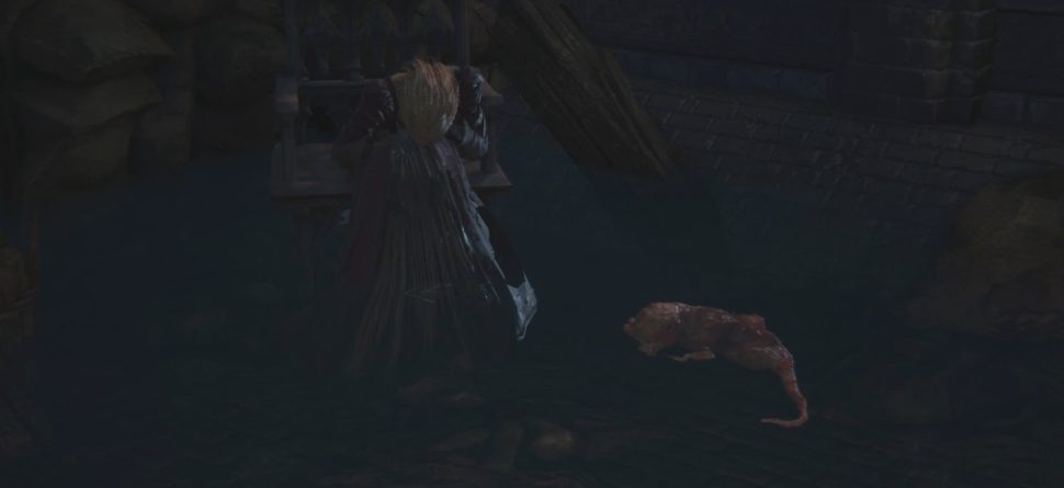 Uccidere il feto permette di recuperare un Terzo cordone ombelicale, identificando il bambino inequivocabilmente come un Grande Essere neonato. Questo, per inciso, è l’unico Terzo cordone per così dire “fresco” di tutto il gioco, recuperato direttamente dalla creatura a cui appartiene: tutti gli altri, come vedremo, sono lasciti di figli di Grandi Esseri già defunti da tempo, che vari eruditi di Yharnam stanno utilizzando come reliquie per entrare in comunicazione con vari Grandi Esseri nel Mondo dei Sogni.