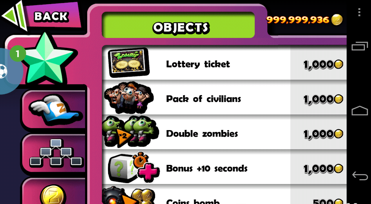 Per ottenere monete illimitate (come potete vedere nell’angolo in alto a destra di questa immagine) vi basterà installare l‘apk di Zombie Tsunami. L’apk non è altro che una versione modificata dell’applicazione, che vi permetterà di sbloccare gratuitamente tutti gli oggetti, i potenziamenti e i bonus che normalmente avreste dovuto comprare con soldi reali.
